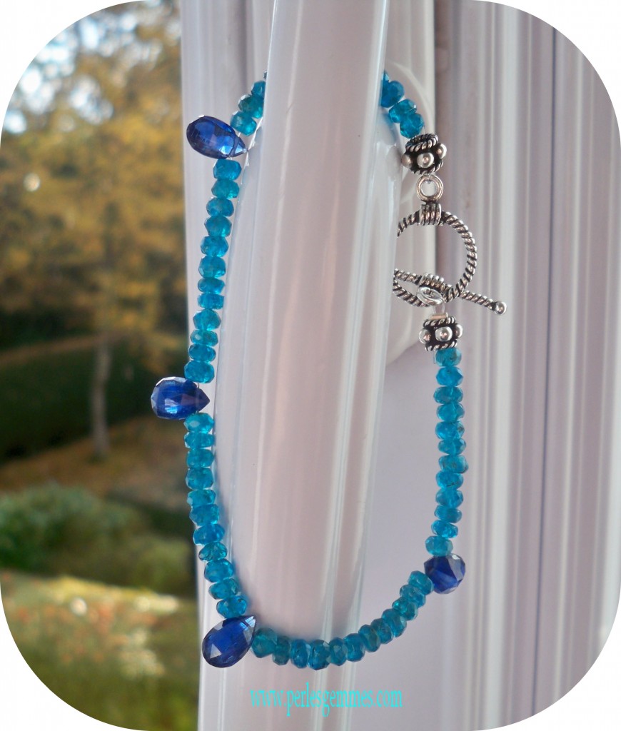 J’aime particulièrement les Cyanites : les briolettes bleu indigo du premier bracelet ; Cyanites du Népal, entièrement naturelles et tellement rares associées aux Apatites rondes de Madagascar facettées, d’un bleu-vert, rare lui aussi.