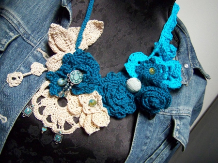 Ici une déclinaison dans les nuances de bleu à travers des fleurs au crochet et au tricot