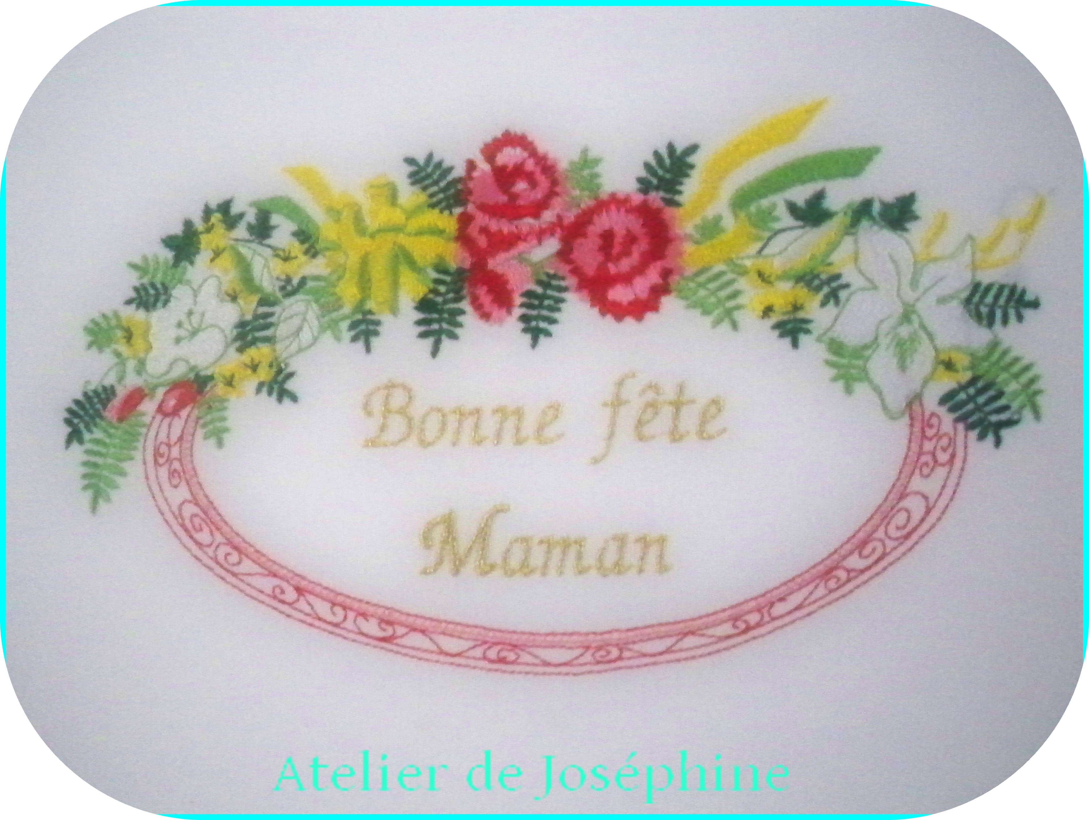 « Bonne fête Maman » est brodé en fil métallisé or.