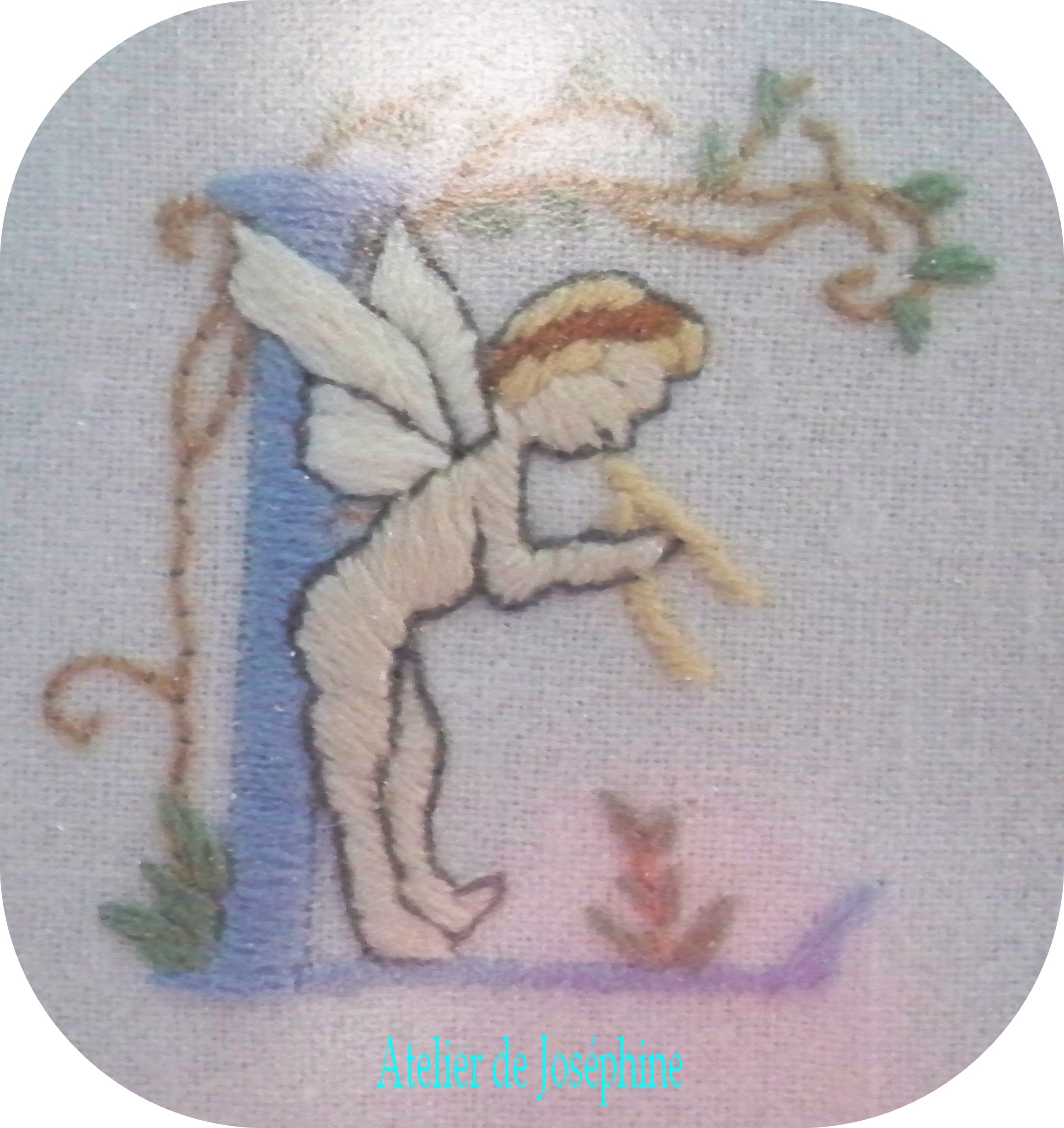 Toujours en mouliné de DMC, point de piqûre pour les sarments de vignes et les contours de l’Ange, point lancé pour le reste de la broderie.