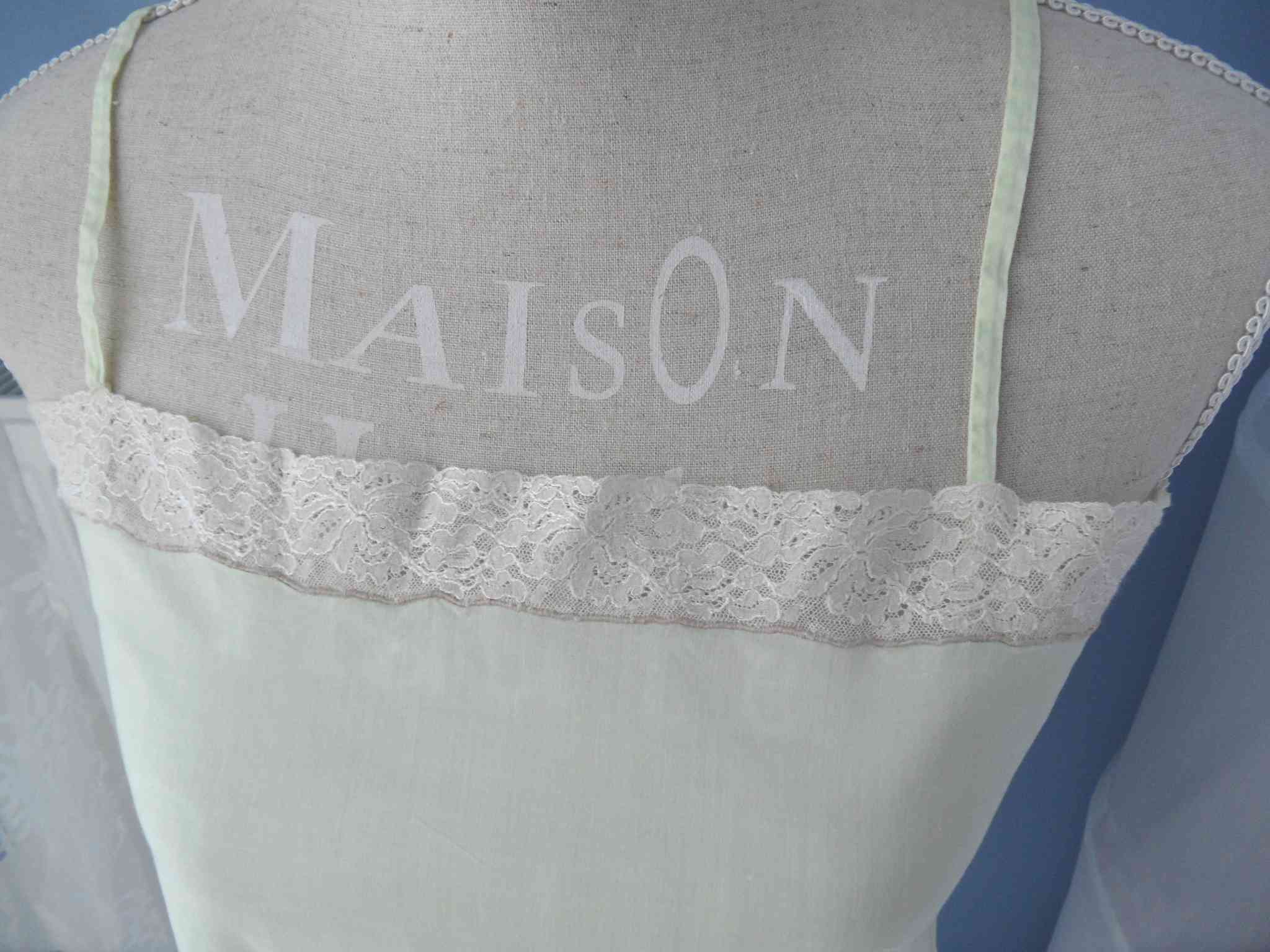 Ici, il s’agit d’une pièce ancienne -100 ans ! – où tout est délicat : la nuance, un vert anis si doux, un coton d’une telle finesse, léger comme une aile de papillon, et la dentelle de Calais si travaillée et raffinée…
