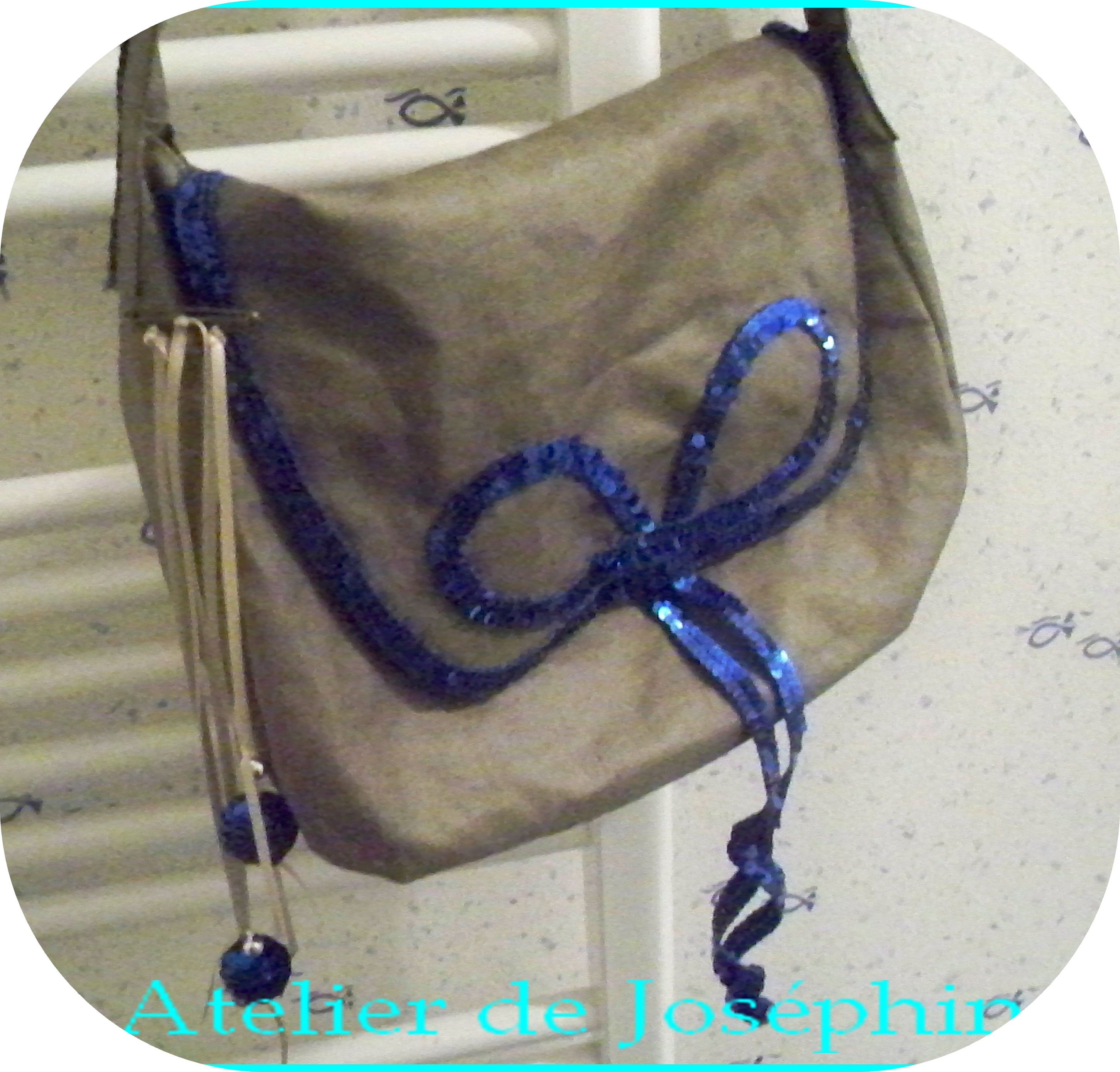 J’aime l’association des couleurs qui forment une jolie harmonie : kaki pour le lin et bleu dur pour le ruban paillettes.
