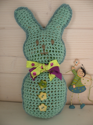 Un doudou craquant dans un turquoise très clair , crochet 4 ou 5