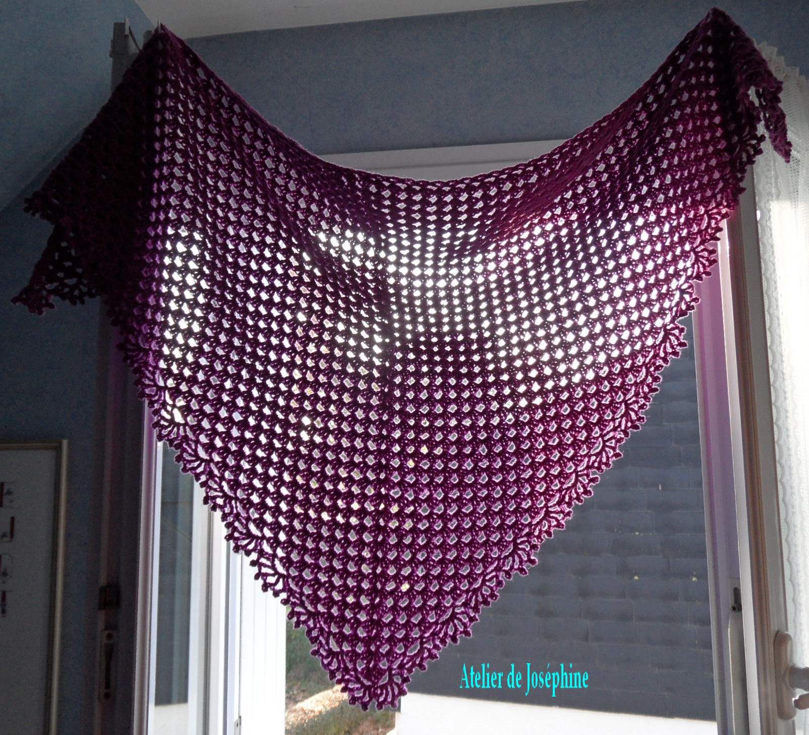 Je l’ai réalisé avec un crochet 4,5 sur 41 rangs. Variante pour la bordure : faire des Triple-brides au lieu des double-brides. 6 pelotes (de 25 gr.) vous seront nécessaires.