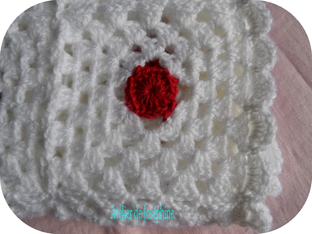 Pour les explications : le carré, le montage utilisé dans l’écharpe Stella, et la bordure sont simples. Crochet 3,5