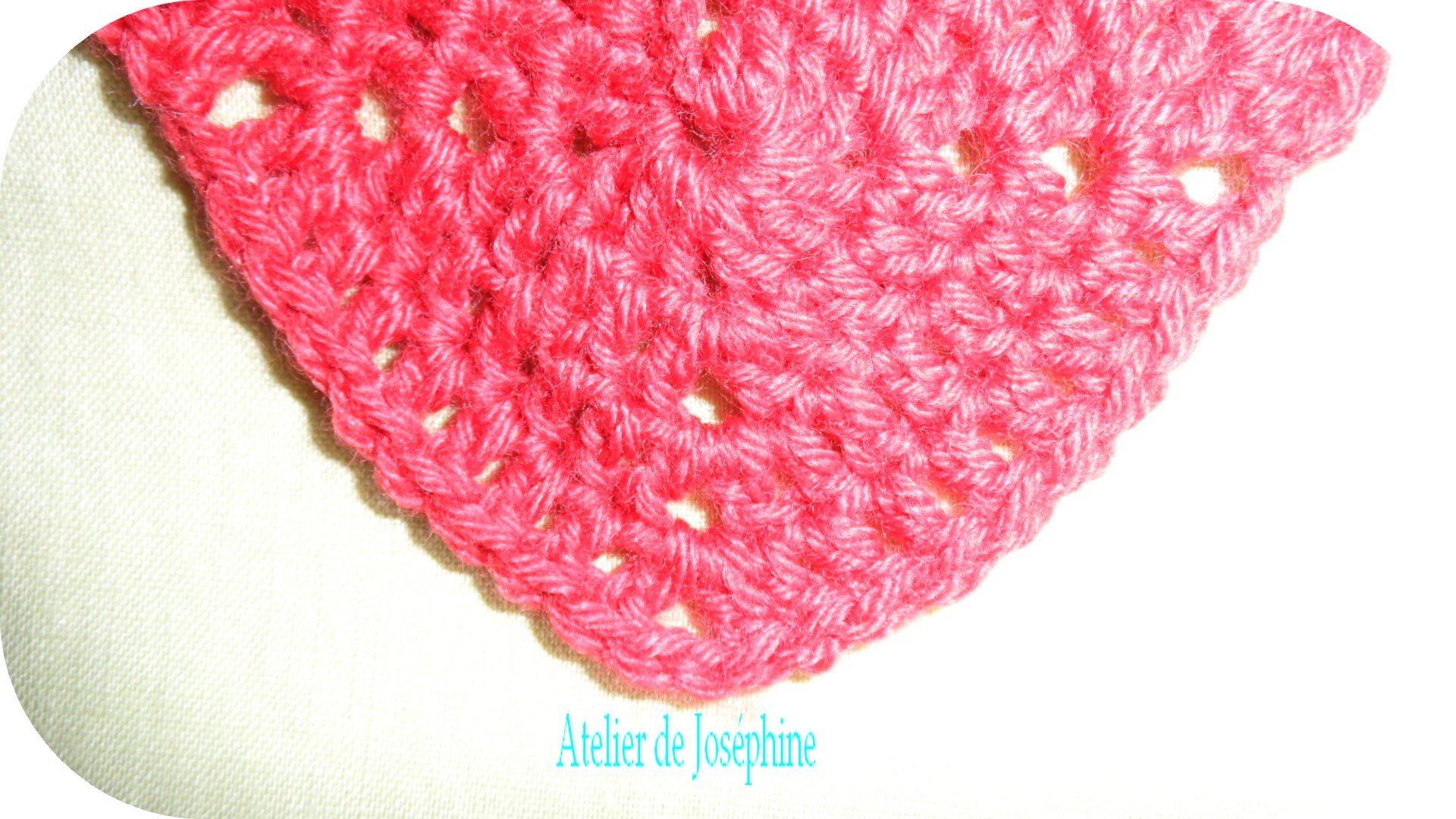 Dans un angle, faire 1 maille coulée, 2 mailles en l’air, 2 brides dans la maille suivante, 2 brides dans la maille suivante, 2 double brides dans la maille suivante à répéter 3 fois, puis 2 brides dans la maille suivante, 2 brides dans la maille suivante, 1 demi bride dans la dernière maille, 1 maille coulée pour terminer.